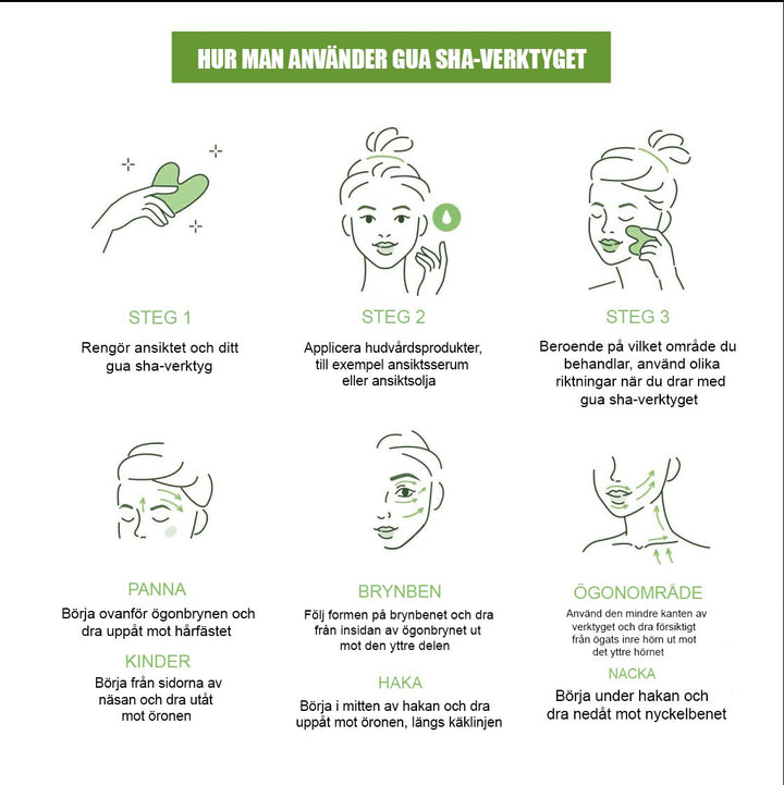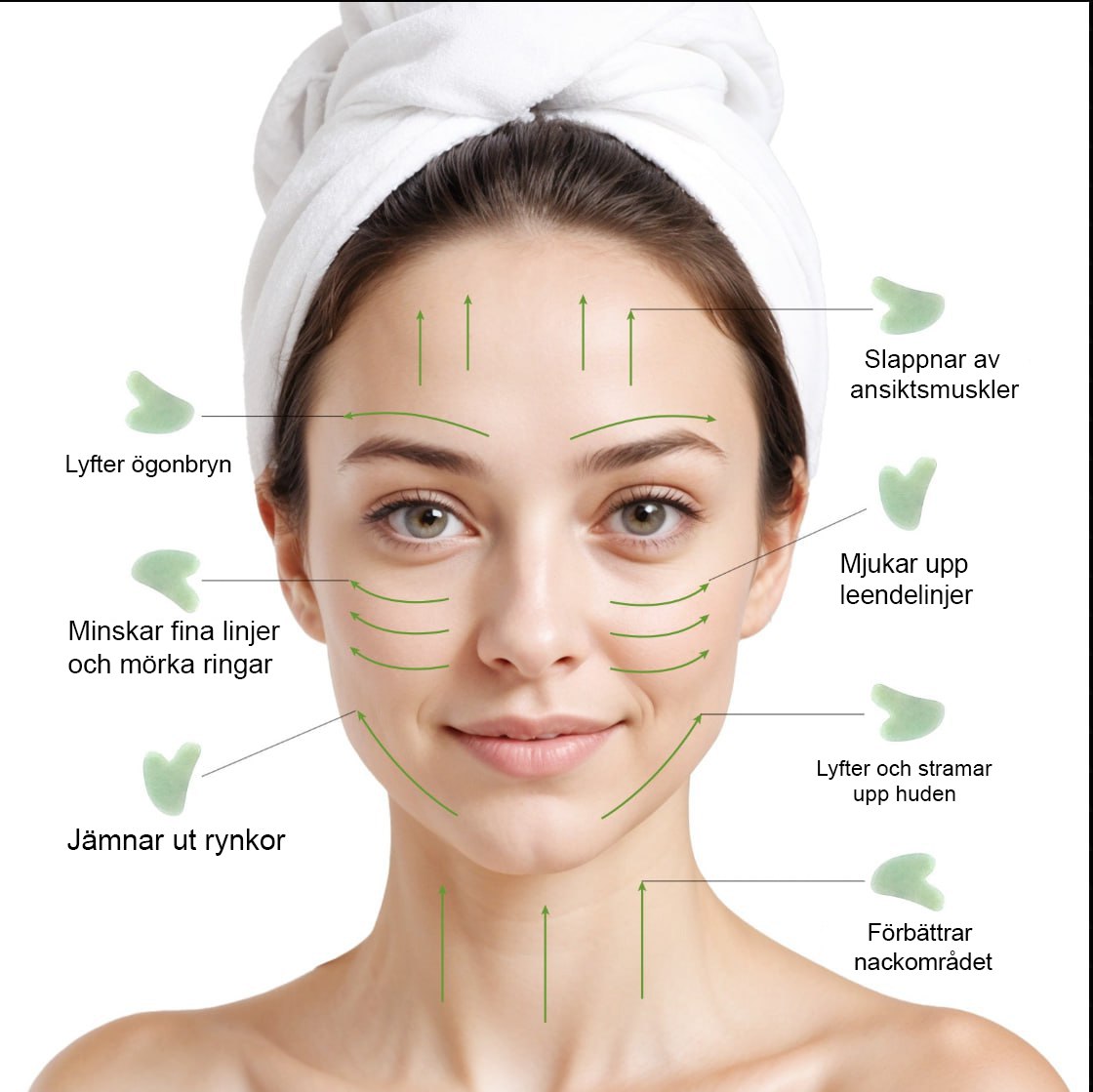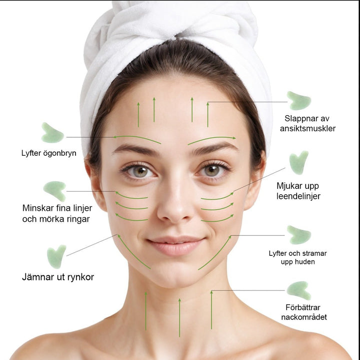 Förutom att främja cirkulationen, erbjuder Gua Sha också en naturlig ansiktslyftning, vilket hjälper till att definiera dina ansiktskonturer och förebygga rynkor. Denna teknik gör det även möjligt för dina hudvårdsprodukter att penetrera djupare in i huden, vilket maximerar deras effektivitet.